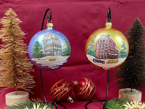 Ab sofort bietet die Tourist-Information Einbeck die neue Weihnachtskugel mit Einbeck-Motiv für das Jahr 2025 an. Die mundgeblasene Kugel mit einem Durchmesser von 10 cm ist Teil einer Sammelreihe mit jährlich wechselnden Motiven und wird in Handarbeit dekoriert.
